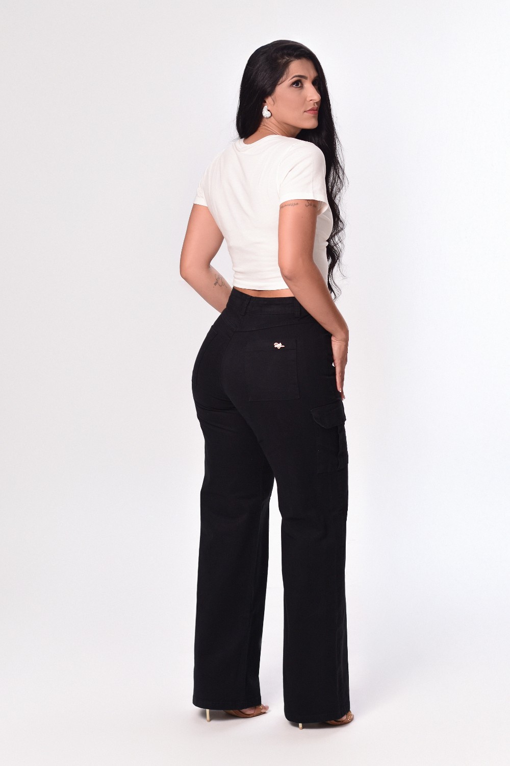 CALCA SARJA ELAST FEM WIDE LEG CARGO PRETO